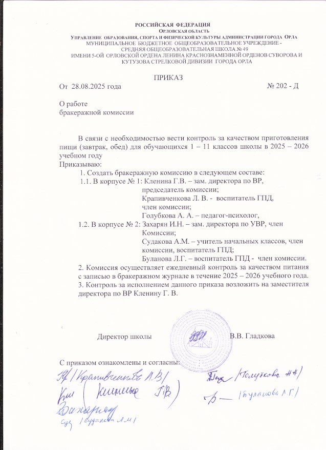 Приказ о работе бракеражной комиссии
